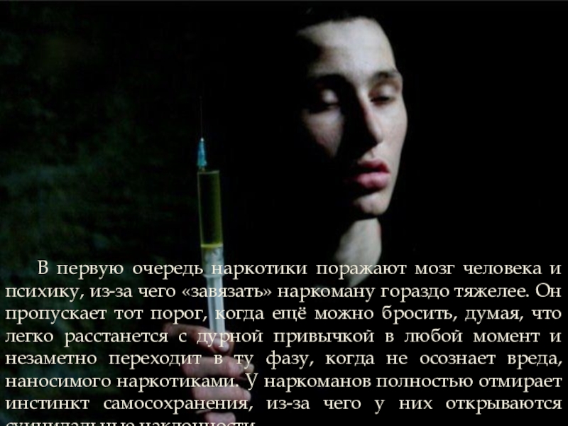 Слайд 8 В первую очередь наркотики поражают мозг человека и психику,