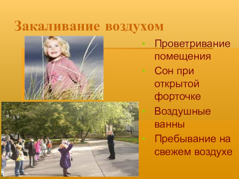 Закаливание воздухомПроветривание помещенияСон при открытой форточкеВоздушные ванныПребывание на свежем воздухе