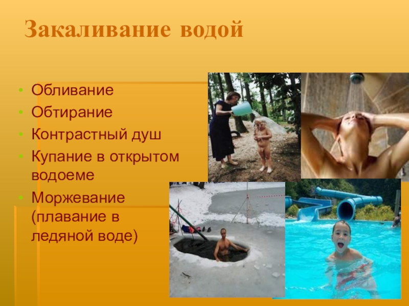 Закаливание водой ОбливаниеОбтираниеКонтрастный душКупание в открытом водоемеМоржевание (плавание в ледяной воде)
