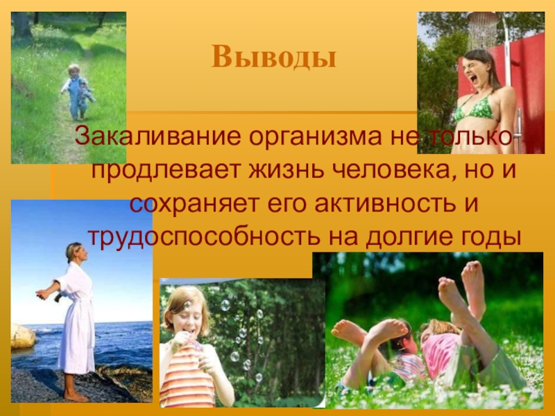 ВыводыЗакаливание организма не только продлевает жизнь человека, но и сохраняет его активность и трудоспособность на долгие годы