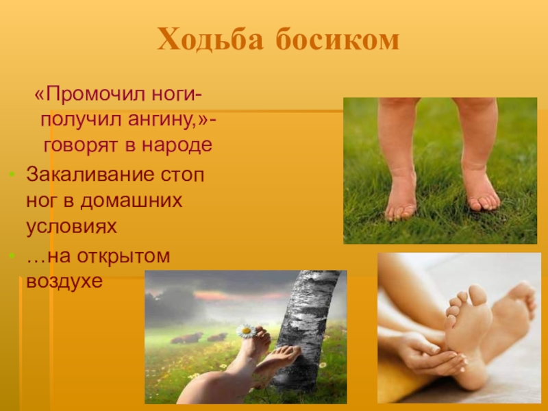 Ходьба босиком «Промочил ноги-получил ангину,»-говорят в народеЗакаливание стоп ног в домашних условиях…на открытом воздухе