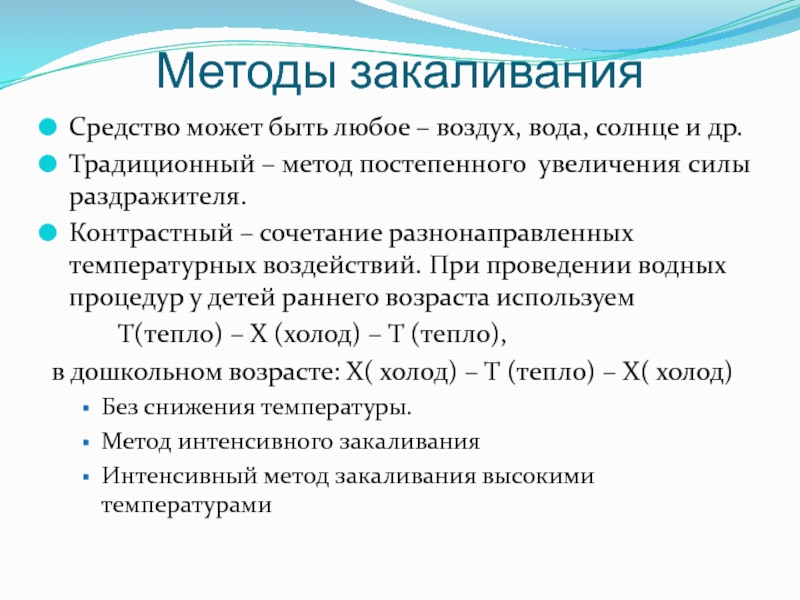 Методы закаливанияСредство может быть любое – воздух, вода, солнце и др.Традиционный – метод постепенного увеличения силы раздражителя.Контрастный