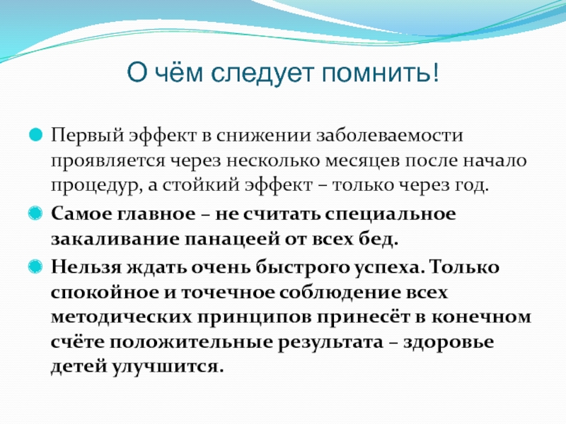О чём следует помнить!Первый эффект в снижении заболеваемости проявляется через несколько месяцев после начало процедур, а стойкий