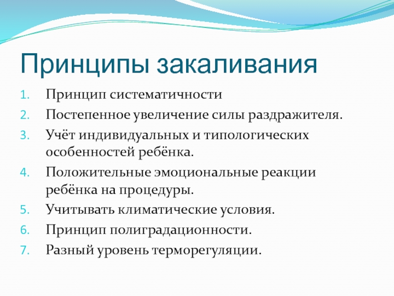 Принципы закаливанияПринцип систематичностиПостепенное увеличение силы раздражителя.Учёт индивидуальных и типологических особенностей ребёнка.Положительные эмоциональные реакции ребёнка на процедуры.Учитывать климатические