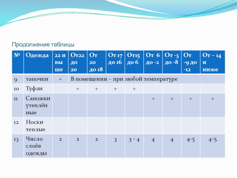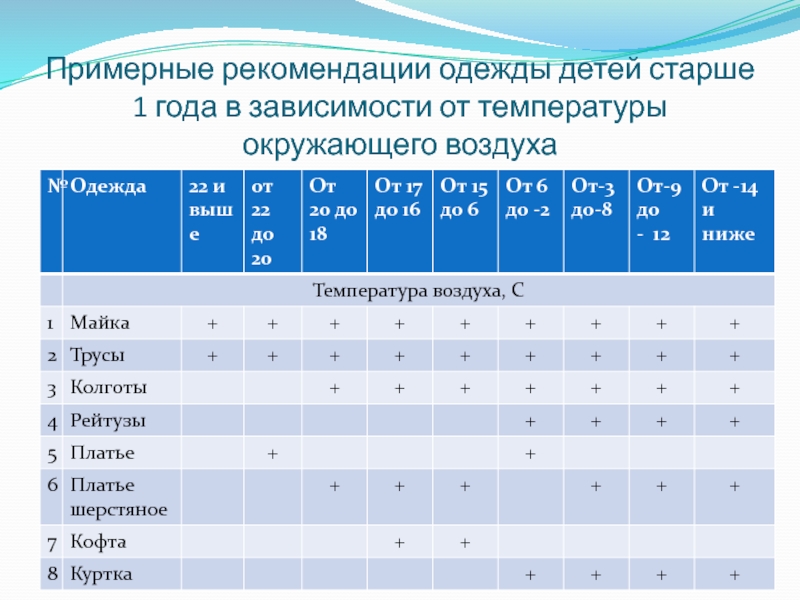 Слайд 5Примерные рекомендации одежды детей старше 1 года в зависимости от температуры