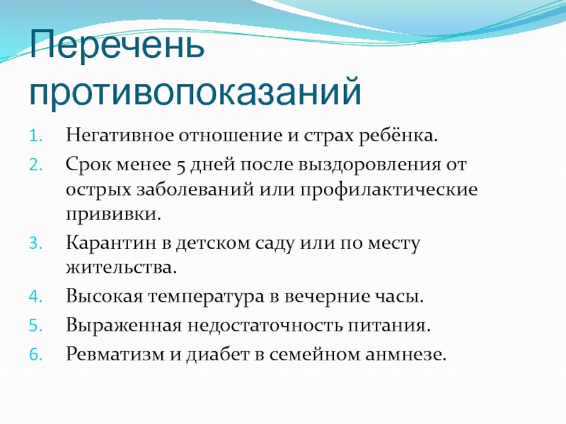 Перечень противопоказанийНегативное отношение и страх ребёнка.Срок менее 5 дней после выздоровления от острых заболеваний или профилактические прививки.Карантин
