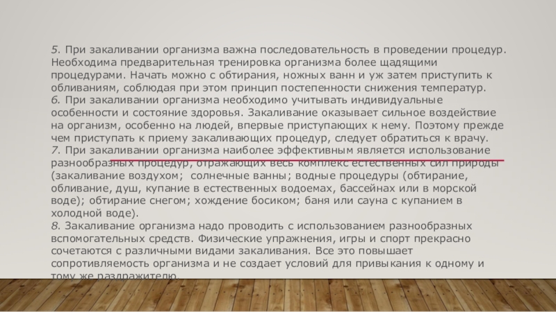 6. При закаливании организма необходимо учитывать индивидуальные особенности и состояние здоровья. Закаливание оказывает сильное воздействие на организм, особенно на людей, впервые приступающих к нему. Поэтому прежде чем приступать к приему закаливающих процедур, следует обратиться к врачу.