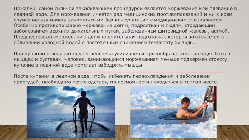 Слайд 5Пожалуй, самой сильной закаливающей процедурой является моржевание или плавание в ледяной