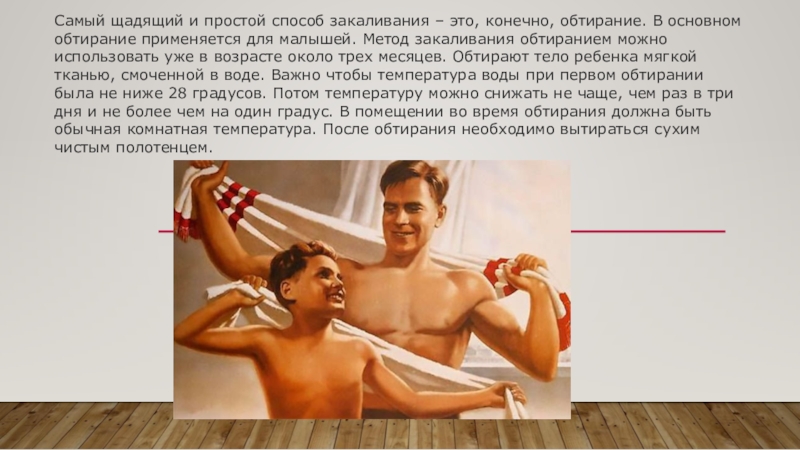 Слайд 7Самый щадящий и простой способ закаливания – это, конечно, обтирание. В