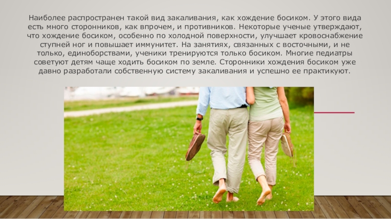 Слайд 4Наиболее распространен такой вид закаливания, как хождение босиком. У этого вида
