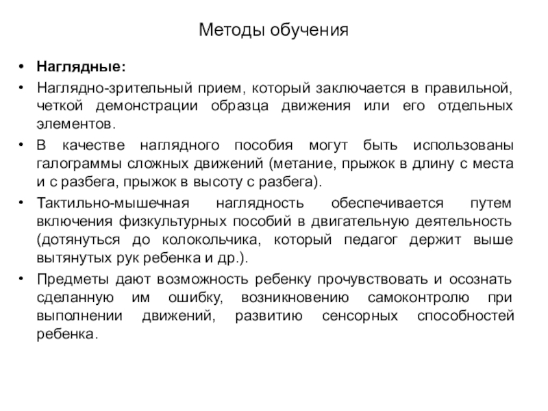 Тактильно-мышечная наглядность обеспечивается путем включения физкультурных пособий в двигательную деятельность (дотянуться до колокольчика, который педагог держит выше вытянутых рук ребенка и др.).