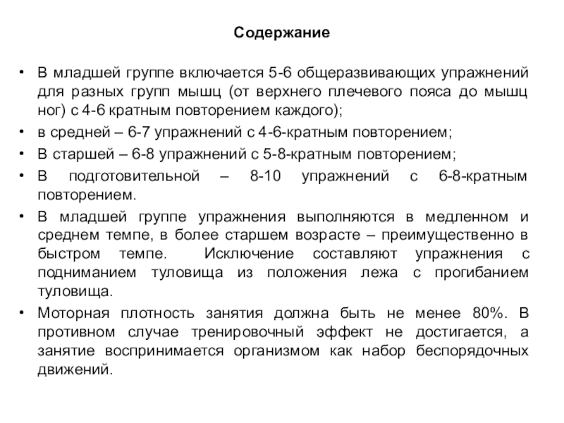 В младшей группе включается 5-6 общеразвивающих упражнений для разных групп мышц