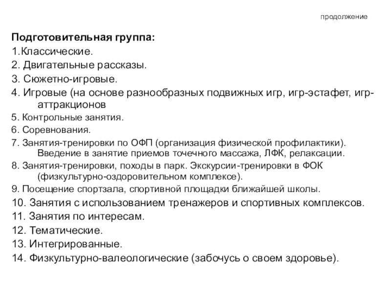 При втором подходе выделяют обучающие, развивающие и оздоровительные занятия.