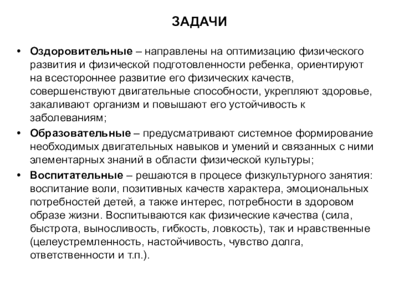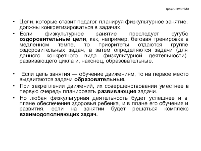Цели, которые ставит педагог, планируя физкультурное занятие, должны конкретизироваться в задачах.