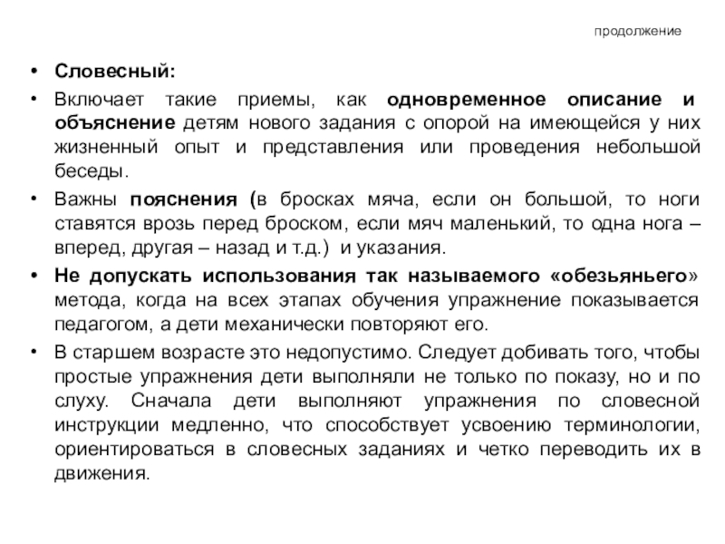 Не допускать использования так называемого «обезьяньего» метода, когда на всех этапах обучения упражнение показывается педагогом, а дети механически повторяют его.