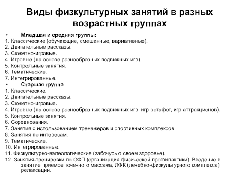 Слайд 12Виды физкультурных занятий в разных возрастных группах
