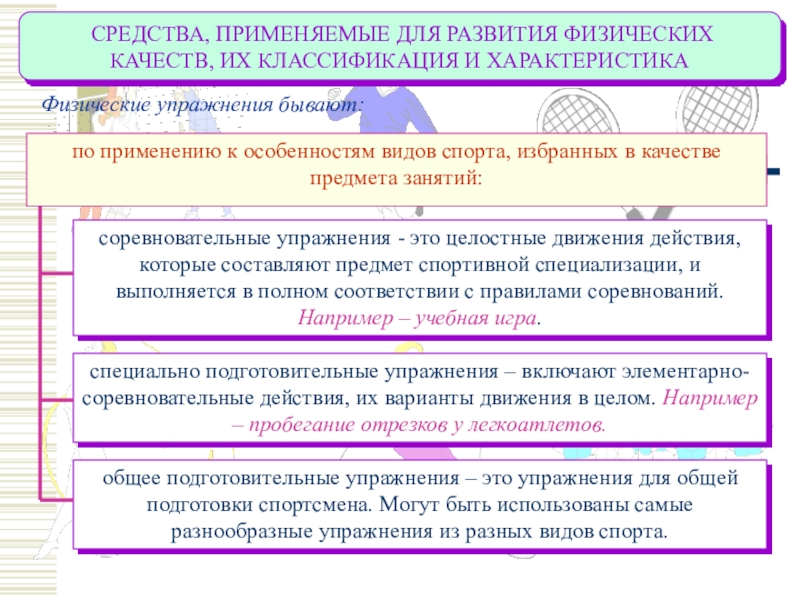 специально подготовительные упражнения – включают элементарно-соревновательные действия, их варианты движения в целом. Например – пробегание отрезков у легкоатлетов.