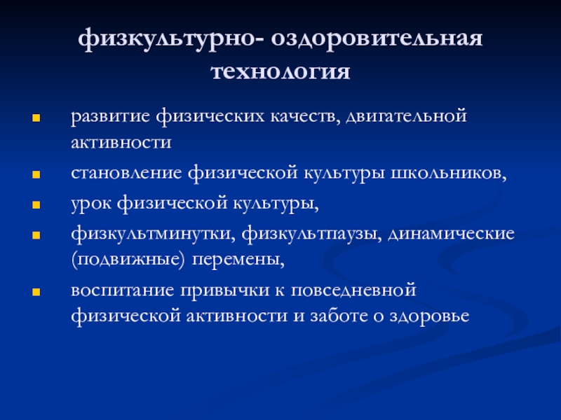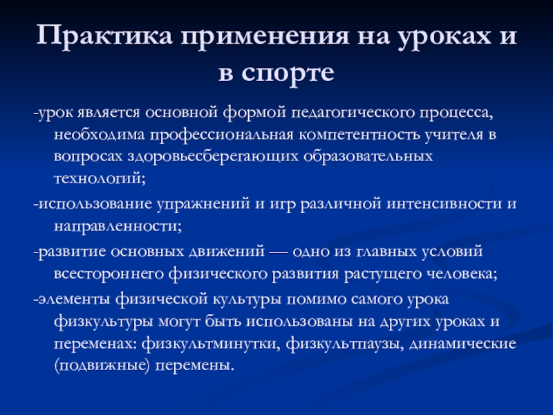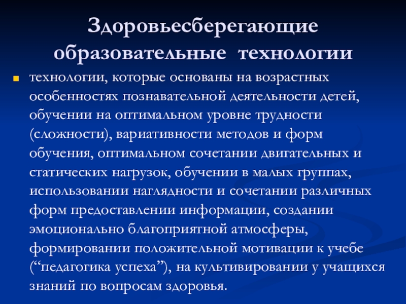 обучении на оптимальном уровне трудности (сложности), вариативности методов и форм обучения, оптимальном сочетании двигательных и статических нагрузок, обучении в малых группах, использовании наглядности и сочетании различных форм предоставлении информации, создании эмоционально благоприятной атмосферы, формировании положительной мотивации к учебе (“педагогика успеха”), на культивировании у учащихся знаний по вопросам здоровья.