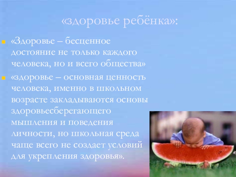 «здоровье – основная ценность человека, именно в школьном возрасте закладываются основы здоровьесберегающего мышления и поведения личности, но школьная среда чаще всего не создает условий для укрепления здоровья».