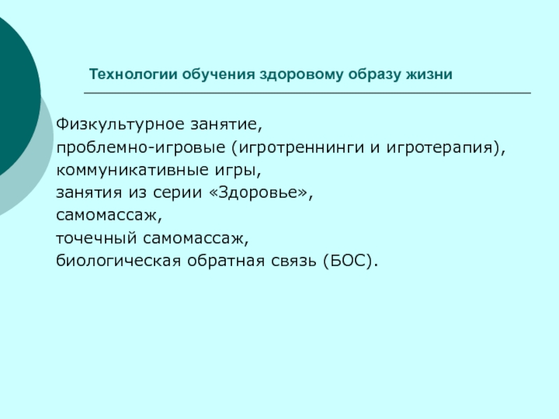 Технологии обучения здоровому образу жизни Физкультурное занятие, проблемно-игровые (игротреннинги и игротерапия),коммуникативные игры, занятия из серии «Здоровье», самомассаж,