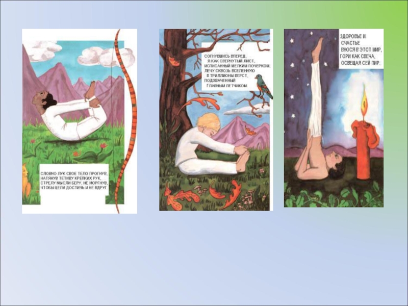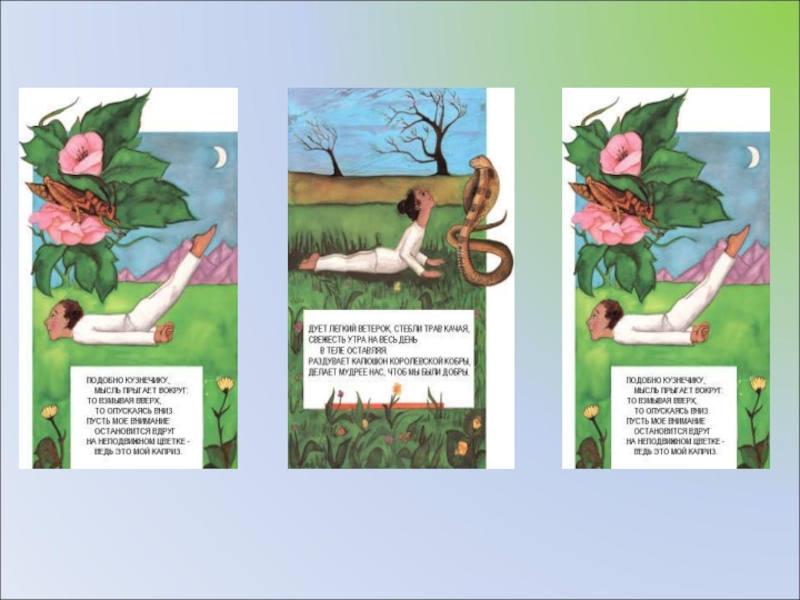 Позиция релаксации, обе руки подняты к потолку. Выдыхая, опустить до уровня пола. Одновременно обе руки поднять на 10 см над полом (двидение от плеча), 3 пружинистых рывка над полом, при этом дышать прерывисто. Без движения вдохнуть. Затем следуют еще 3 рывкообразных движения. 10 повторов.