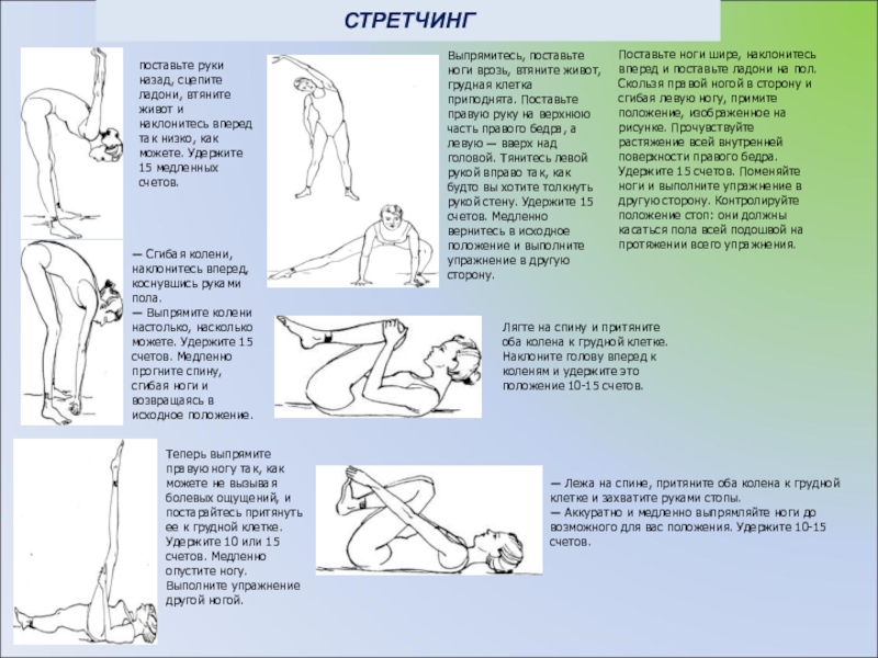 — Выпрямите колени настолько, насколько можете. Удержите 15 счетов. Медленно прогните спину, сгибая ноги и возвращаясь в исходное положение.