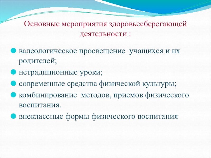 Основные мероприятия здоровьесберегающей деятельности :