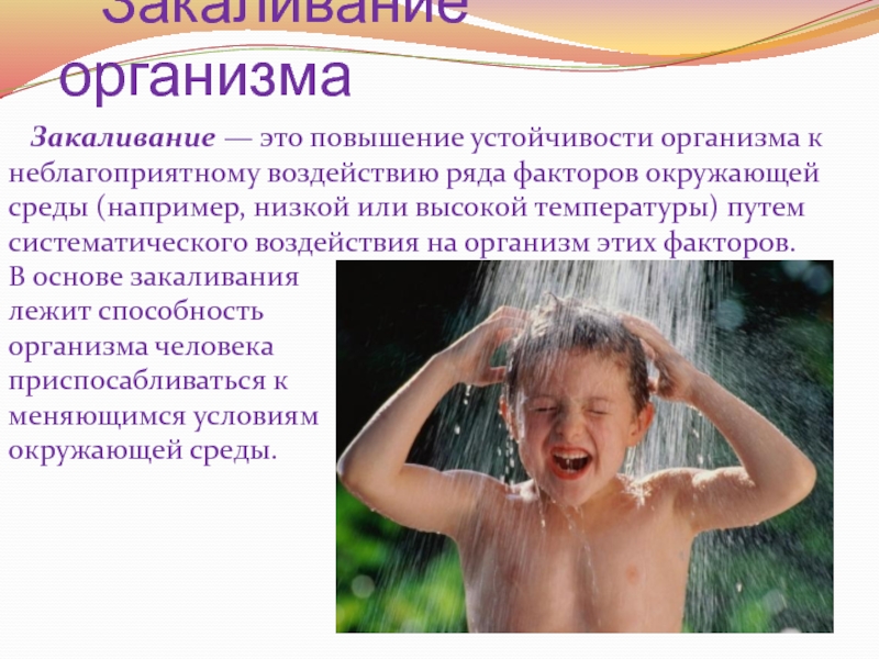 В основе закаливания лежит способность организма человека приспосабливаться к меняющимся условиям окружающей среды.