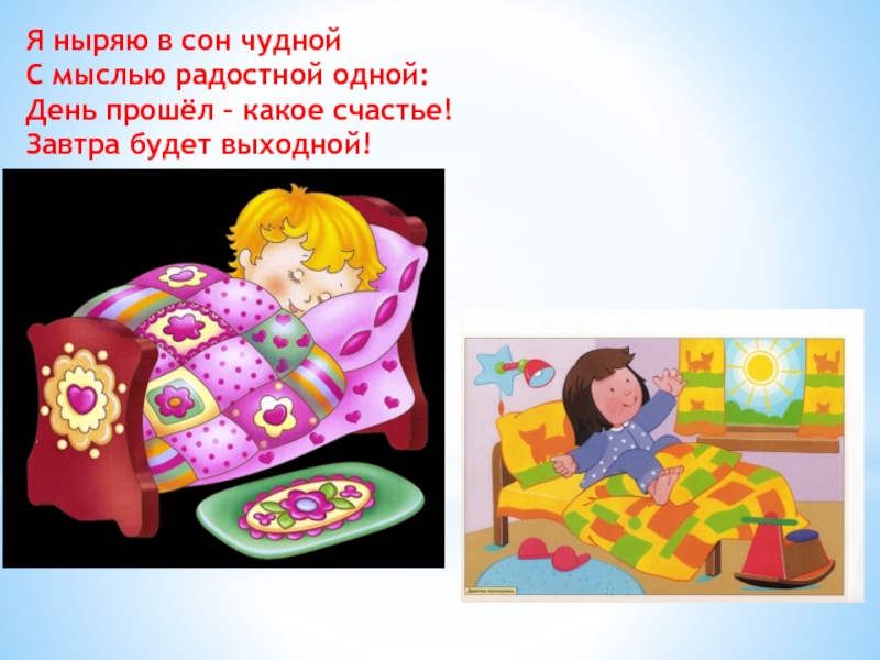Я ныряю в сон чуднойС мыслью радостной одной:День прошёл – какое счастье!Завтра будет выходной!