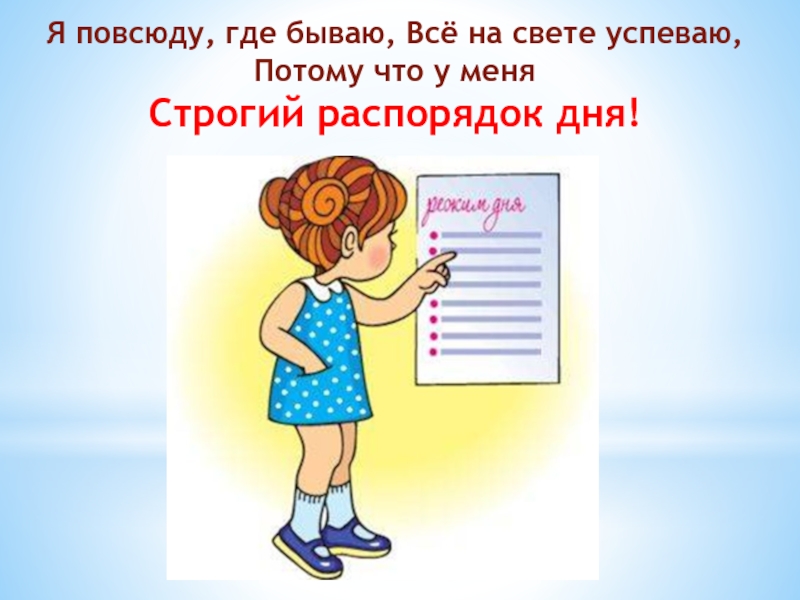 Я повсюду, где бываю, Всё на свете успеваю, Потому что у меняСтрогий распорядок дня!