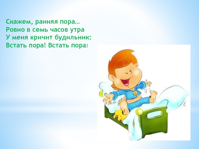 Скажем, ранняя пора…Ровно в семь часов утраУ меня кричит будильник:Встать пора! Встать пора!
