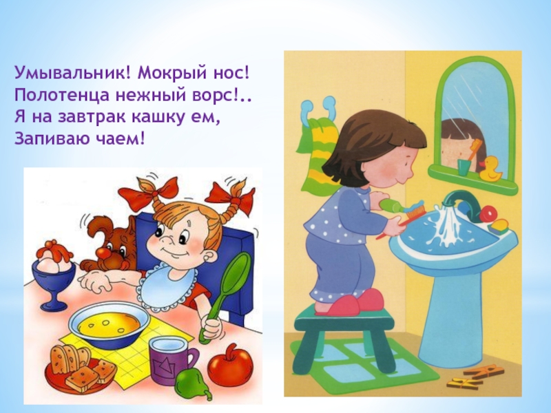 Умывальник! Мокрый нос!Полотенца нежный ворс!..Я на завтрак кашку ем,Запиваю чаем!