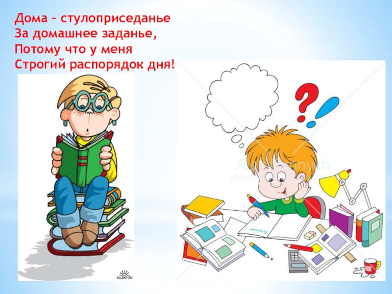 Дома – стулоприседаньеЗа домашнее заданье,Потому что у меняСтрогий распорядок дня!