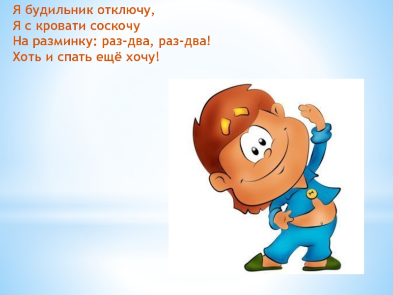 Я будильник отключу,Я с кровати соскочуНа разминку: раз-два, раз-два!Хоть и спать ещё хочу!
