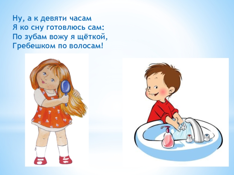 Ну, а к девяти часамЯ ко сну готовлюсь сам:По зубам вожу я щёткой,Гребешком по волосам!