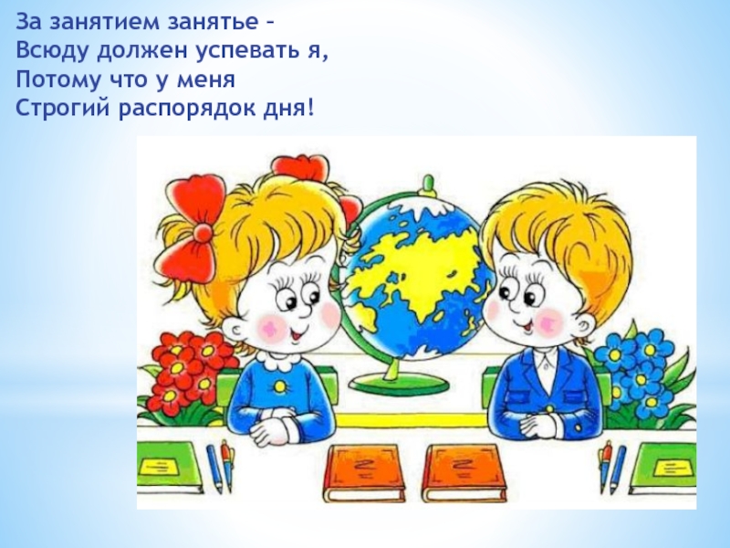 За занятием занятье –Всюду должен успевать я,Потому что у меняСтрогий распорядок дня!