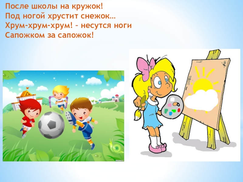 После школы на кружок!Под ногой хрустит снежок…Хрум-хрум-хрум! – несутся ногиСапожком за сапожок!