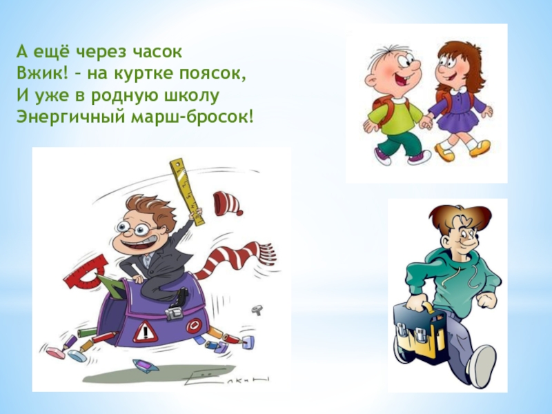 А ещё через часокВжик! – на куртке поясок,И уже в родную школуЭнергичный марш-бросок!