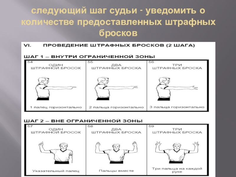Слайд 5следующий шаг судьи - уведомить о количестве предоставленных штрафных бросков
