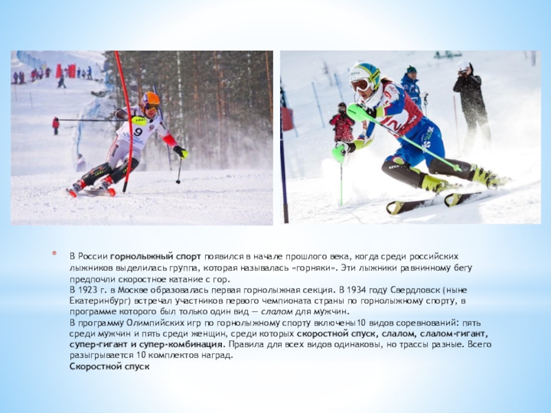 В 1923 г. в Москве образовалась первая горнолыжная секция. В 1934 году Свердловск (ныне Екатеринбург) встречал участников первого чемпионата страны по горнолыжному спорту, в программе которого был только один вид — слалом для мужчин.