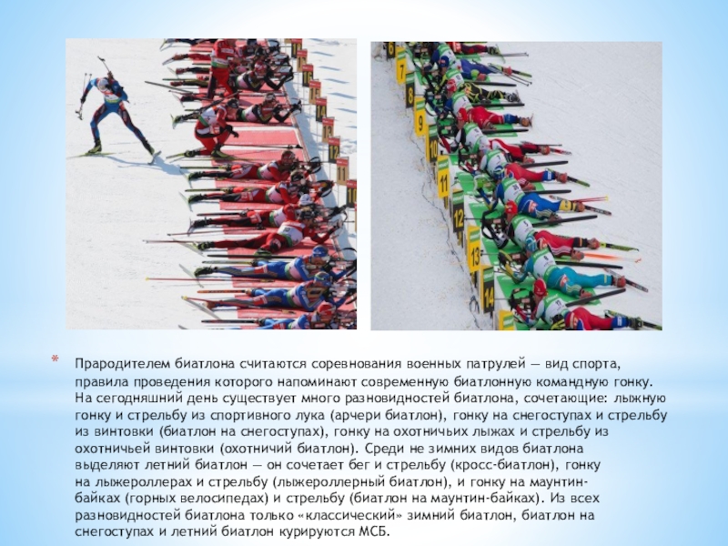 Слайд 3Прародителем биатлона считаются соревнования военных патрулей — вид спорта, правила проведения которого
