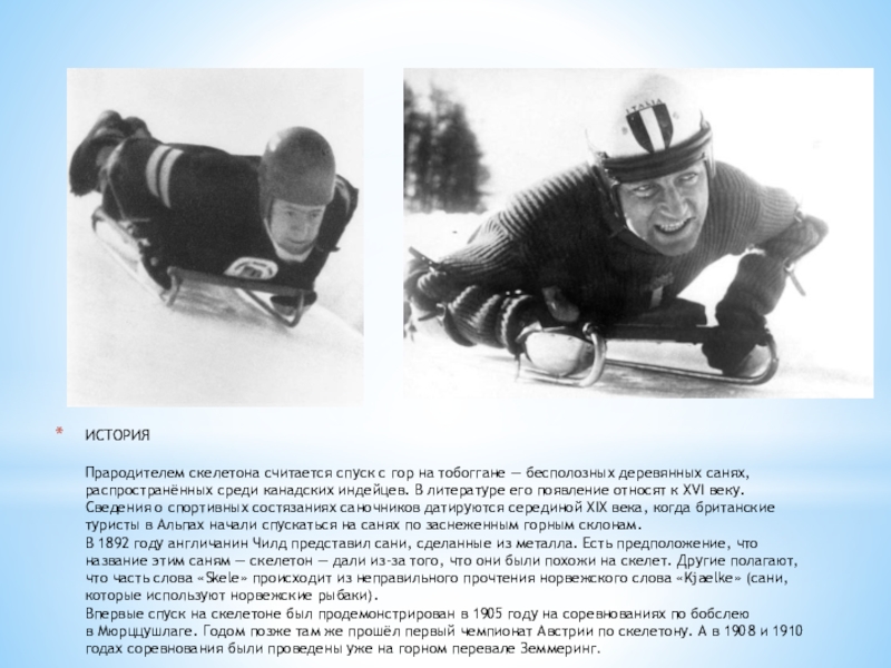 Прародителем скелетона считается спуск с гор на тобоггане — бесполозных деревянных санях, распространённых