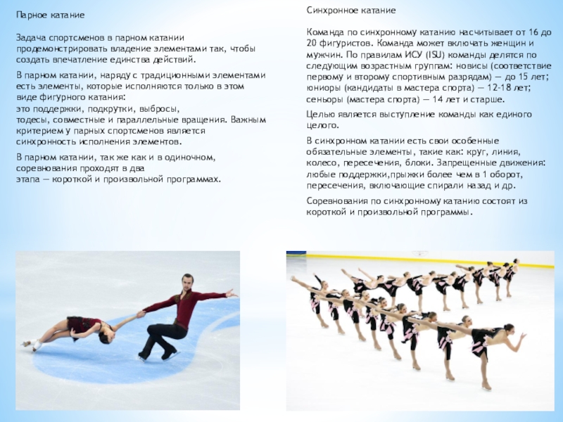 переменами направления скольжения и выполнением дополнительных элементов (вращением,прыжками, комбинаций шагов, поддержек и др.) под музыку.