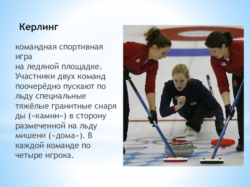 специальные тяжёлые гранитные снаряды («камни») в сторону размеченной на льду мишени («дома»). В каждой команде по четыре игрока.