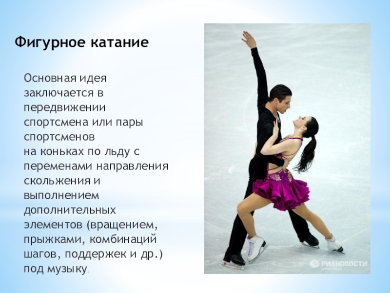 Основная идея заключается в передвижении спортсмена или пары спортсменов на коньках по льду с