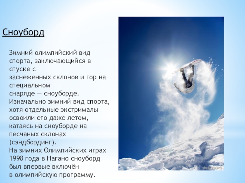 снаряде — сноуборде. Изначально зимний вид спорта, хотя отдельные экстрималы освоили его даже летом, катаясь на сноуборде на песчаных склонах (сэндбординг).