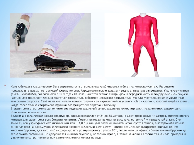 Слайд 24Конькобежцы в классическом беге соревнуются в специальных комбинезонах и бегут на коньках—кляпах.