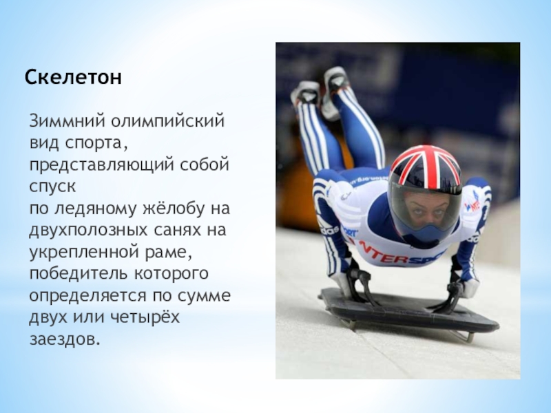 Зиммний олимпийский вид спорта, представляющий собой спуск по ледяному жёлобу на двухполозных санях на укрепленной раме,