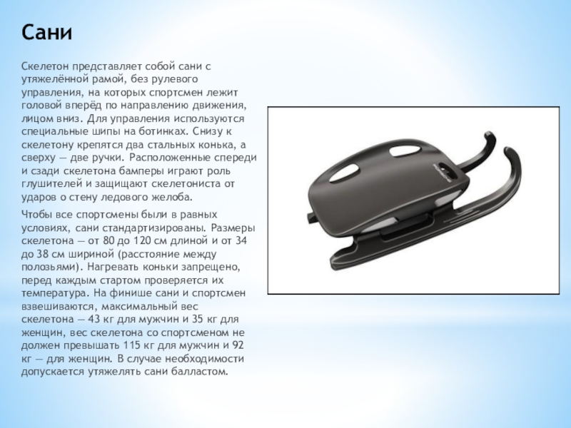 Скелетон представляет собой сани c утяжелённой рамой, без рулевого управления, на