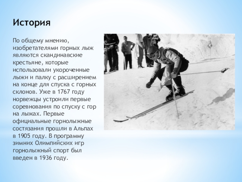 укороченные лыжи и палку с расширением на конце для спуска с горных склонов. Уже в 1767 году норвежцы устроили первые соревнования по спуску с гор на лыжах. Первые официальные горнолыжные состязания прошли в Альпах в 1905 году. В программу зимних Олимпийских игр горнолыжный спорт был введен в 1936 году.